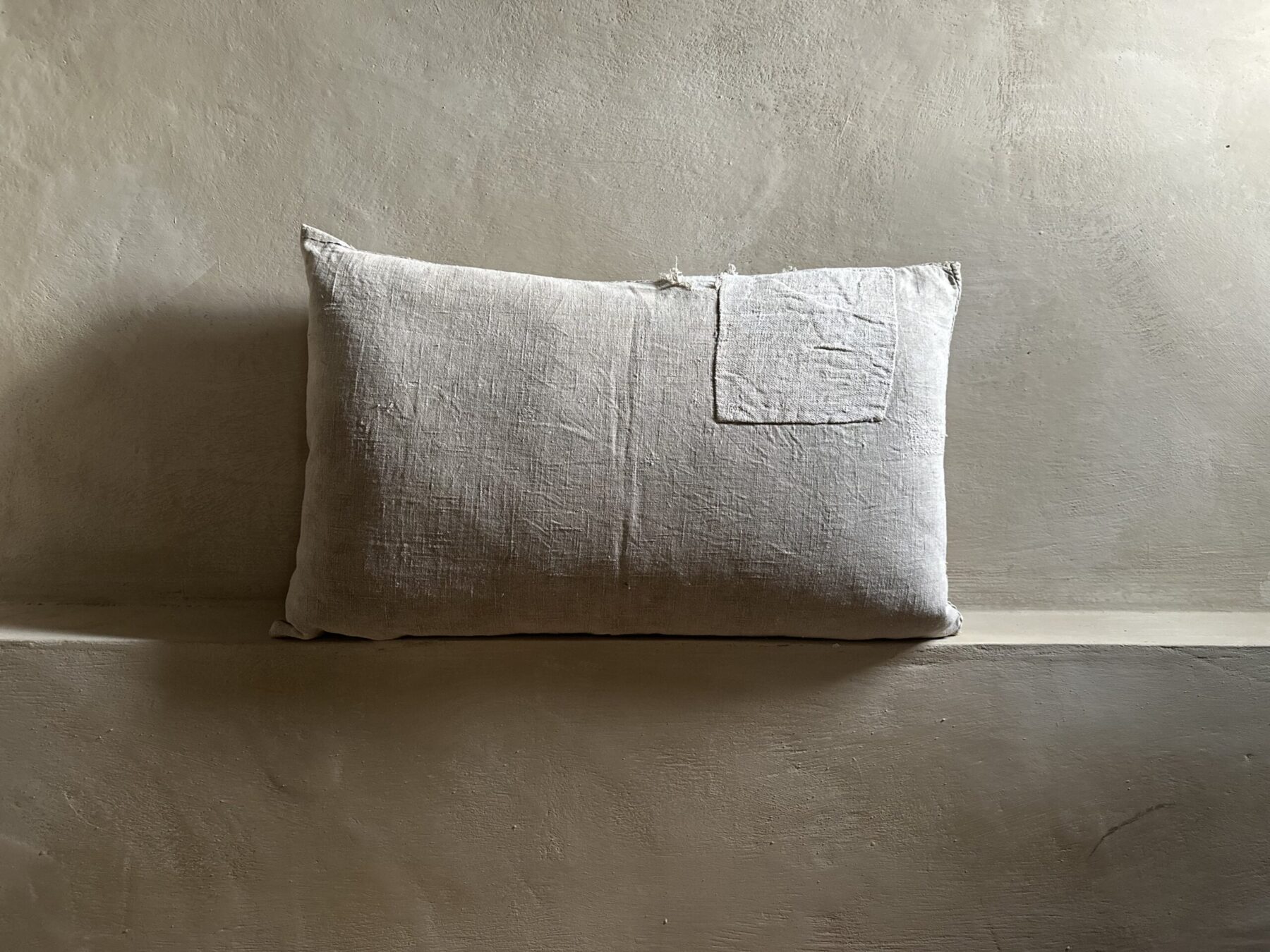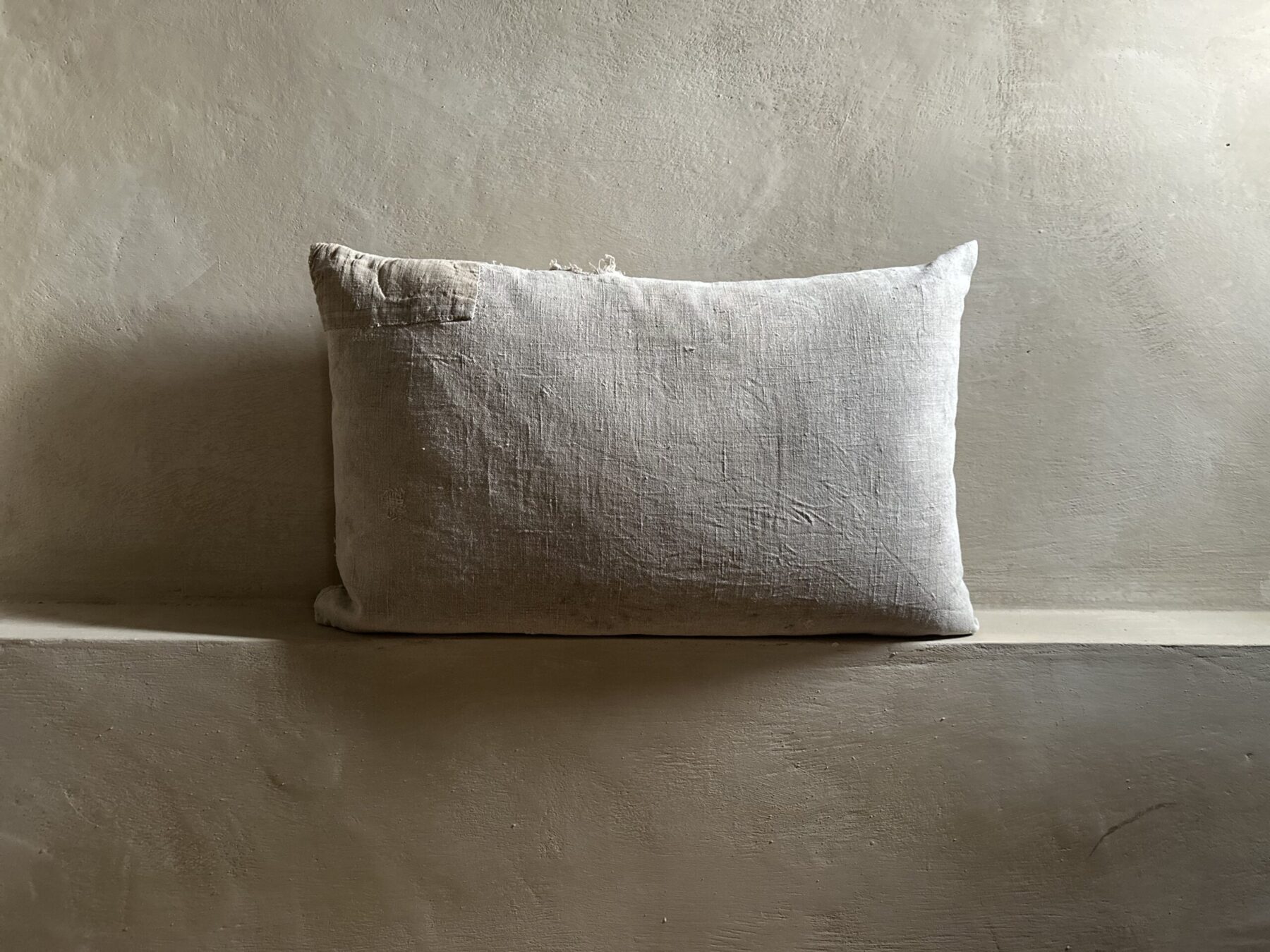 This cushion is made from an antique hand-woven French “Sac de Meunier” (flour bag), made by hemp. Those bags were used to carry wheat and flour in the 19th century and beginning of the 20th century, and used by farmers. This particular bag has been restored many times, I kept it in its condition of origin in order to give unicity to the piece. The small irregularities and imperfections that this cushion might have, are the result of its manual manufacturing process and part of its charm. Traces of usage are part of the natural characteristic of all our vintage textile and its history.